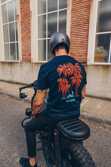 The Bali Memories t-shirt in dark blue is a medium cut men's t-shirt made of 100% organic ring-spun combed cotton. Featuring hand-drawn graphics inspired by outdoor walking in Bali (Indo).