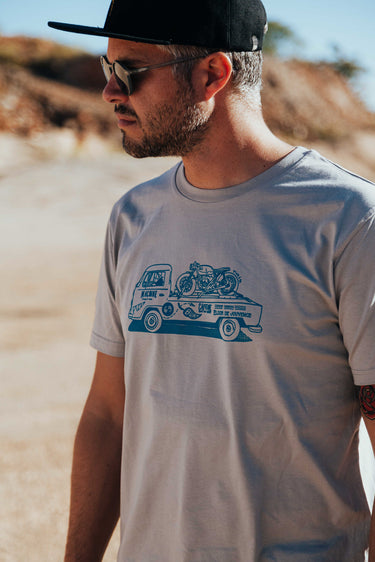 Our Elixir de jouvence Opal T-Shirt is a men's mid-cut t-shirt made from 100% organic combed ring-spun cotton. This classic crew neck features an awesome truck with a caferacer motorcycle on top, straight to the race design, and is hand screen printed.